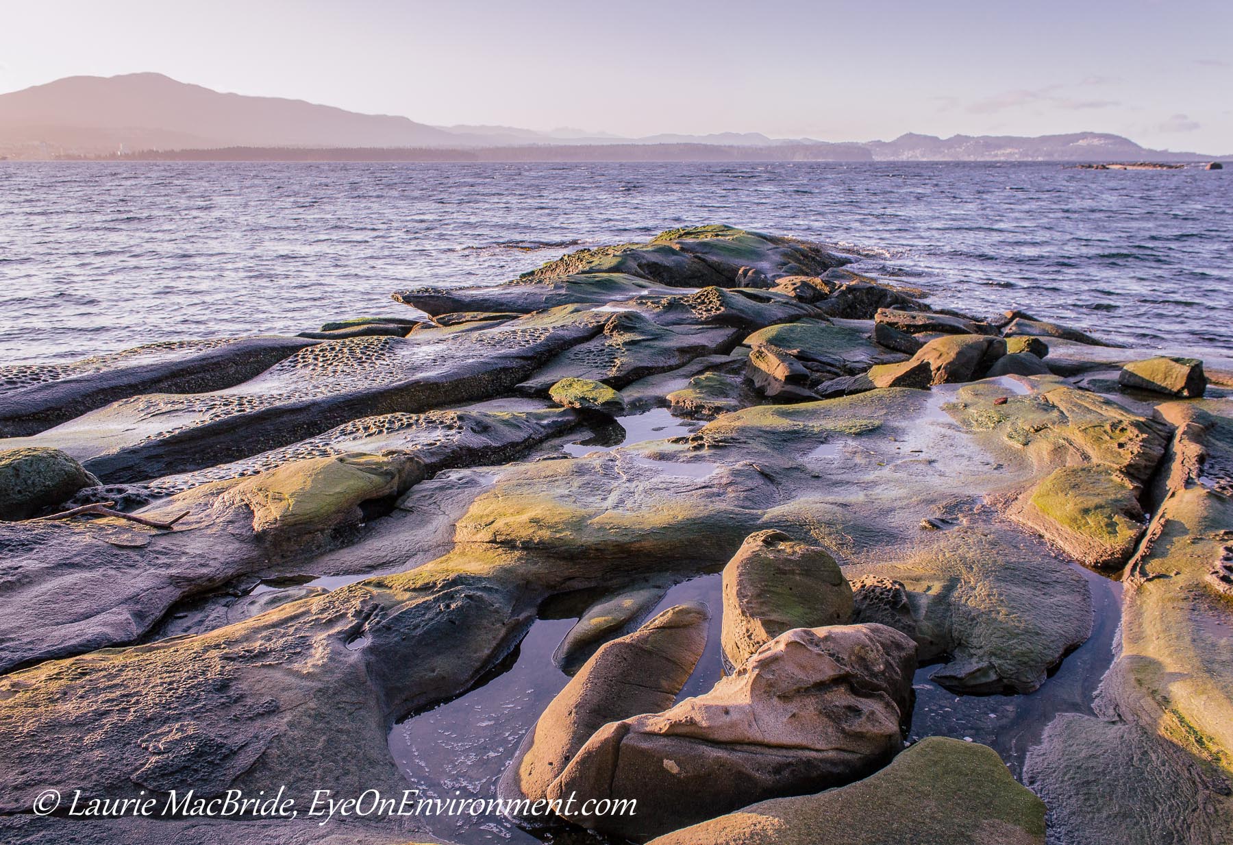 Two years ago almost to the day, I took this photo, looking northwest from Descanso Bay Park on Gabriola Island. The low angle winter sun, combined with the sea and the furrowed sandstone so characteristic of Gabriola’s shores, formed a tapestry of light, shadows and subtle colours that I found visually irresistible.