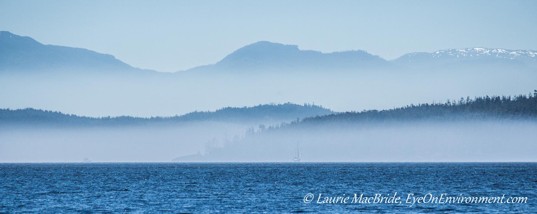 The photo above is from the God’s Pocket area of Queen Charlotte Strait, looking towards the BC mainland. If you click on the image to enlarge it then look closely, you’ll see two ghost-like boats travelling through the mist – making a morning run across the Strait, as we were doing that day.