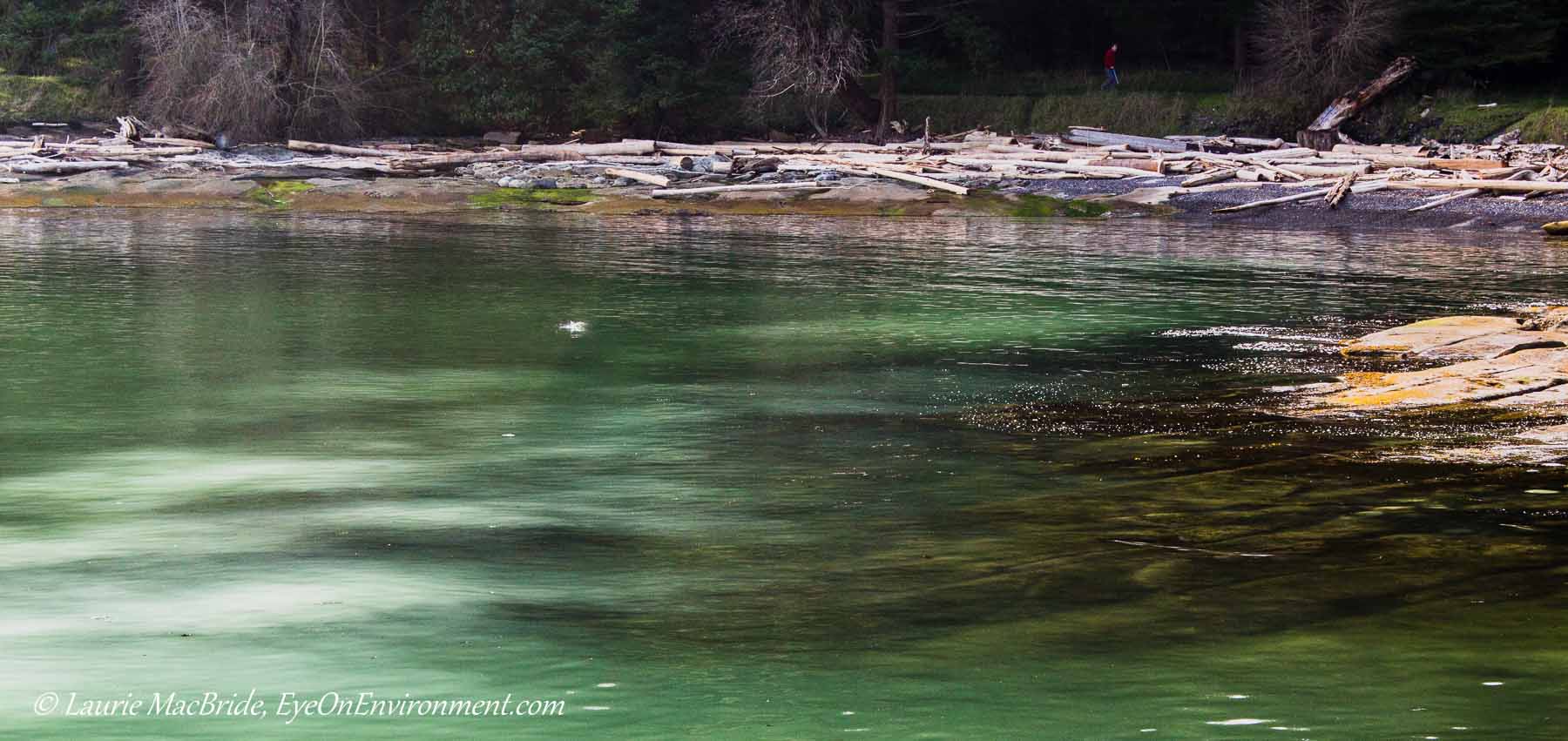 I’ve lived on Gabriola Island for 30 years, and though I’ve seen herring spawn along our other beaches, I’ve never seen it before at Drumbeg Park – where last week, the water in the bay turned milky white with herring spawn, as you can see in this photo (that’s not simply sunlight on the water):