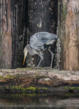 The Great Blue heron in these photos is (at least so far) a survivor of humanity’s assaults on its habitat. It fishes alongside the creosoted pilings of a log sorting ground, with the thump, grind and squeal of boom boat engines, conveyor belts and sawmill blades for a soundscape.