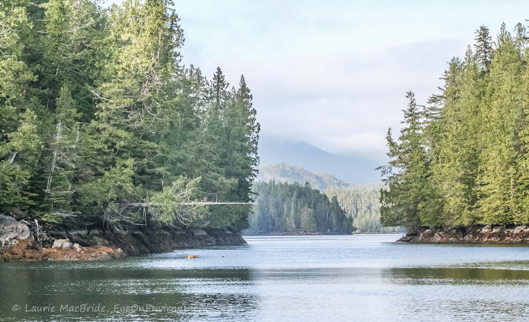 The photo above was taken from our boat on an August evening at about 1800 hours (6 pm in land-talk). We were on our way home from a summer-long journey up the BC coast, and we’d just dropped anchor in a cozy cove at the mouth of Fish Egg Inlet. Before starting dinner preparations, I took a moment to savour and photograph the view: looking through one of the anchorage’s “windows” into adjacent Illahie Inlet, with hints of the Coast Mountain range in the background.