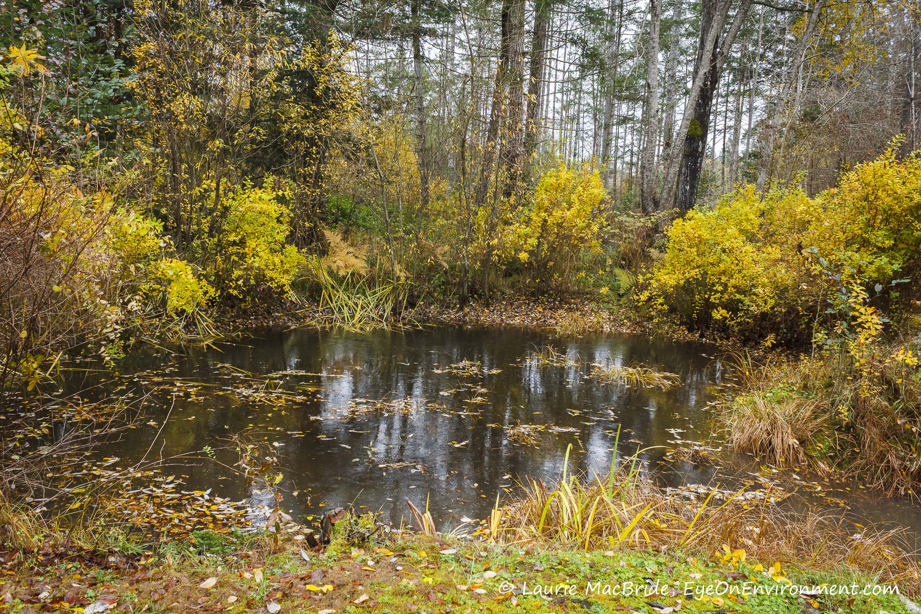 On this typically rainy day in November, I’m thankful for the gold and amber hues of the willows, steeplebush, Bigleaf maples, grasses and bracken around our pond.