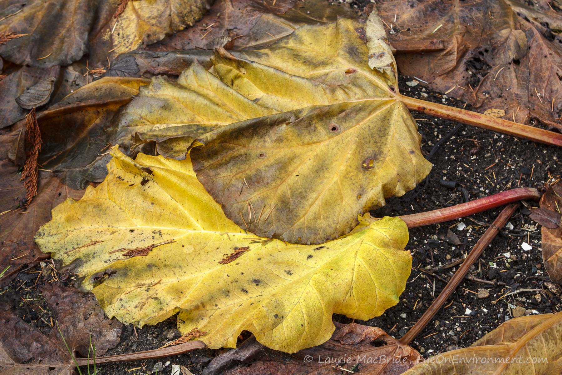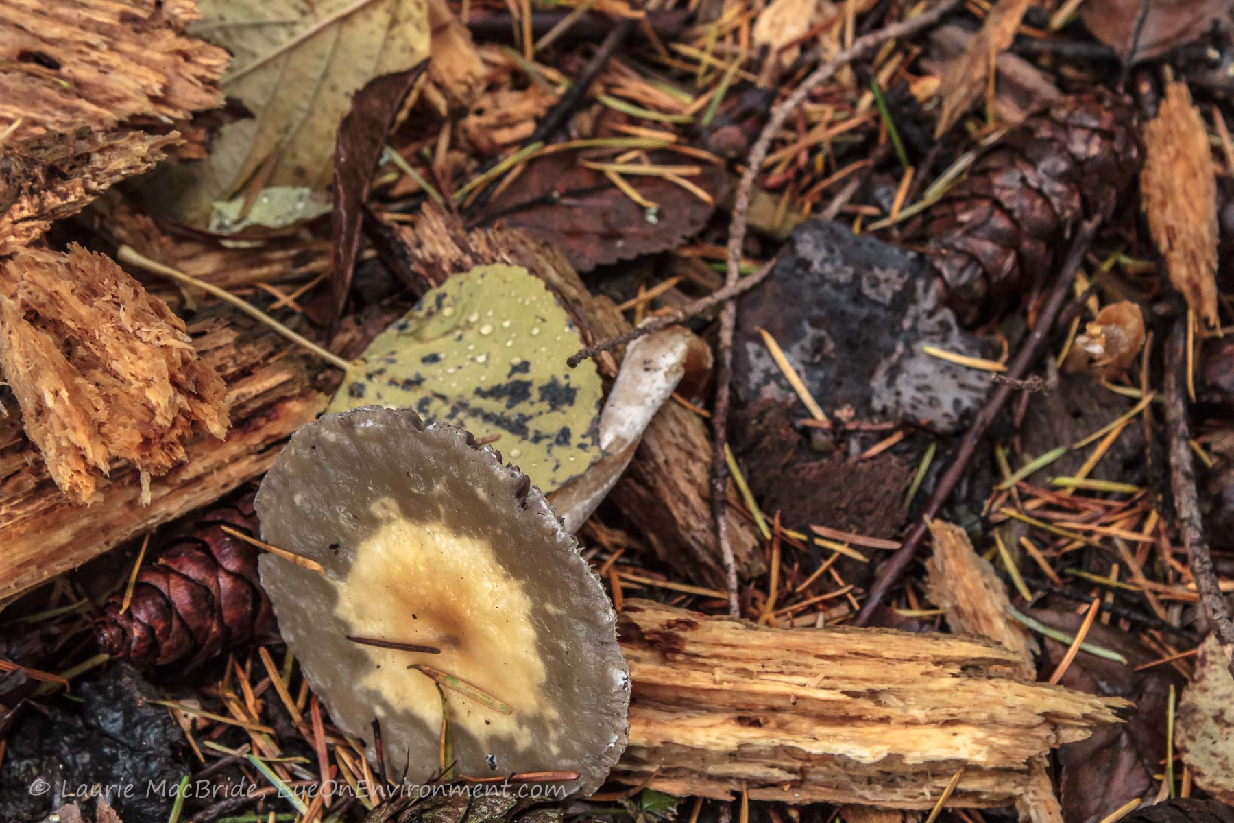 But before I break out my long johns and sunglasses, I’m taking a moment to celebrate the strange beauty that all that rain brought to our garden (photo above) and forest floor (photo below). It’s a beauty that defies conventional definitions – but it’s lovely nonetheless, and you can find it frequently in nature’s annual cycle of decay, if you look closely enough.
