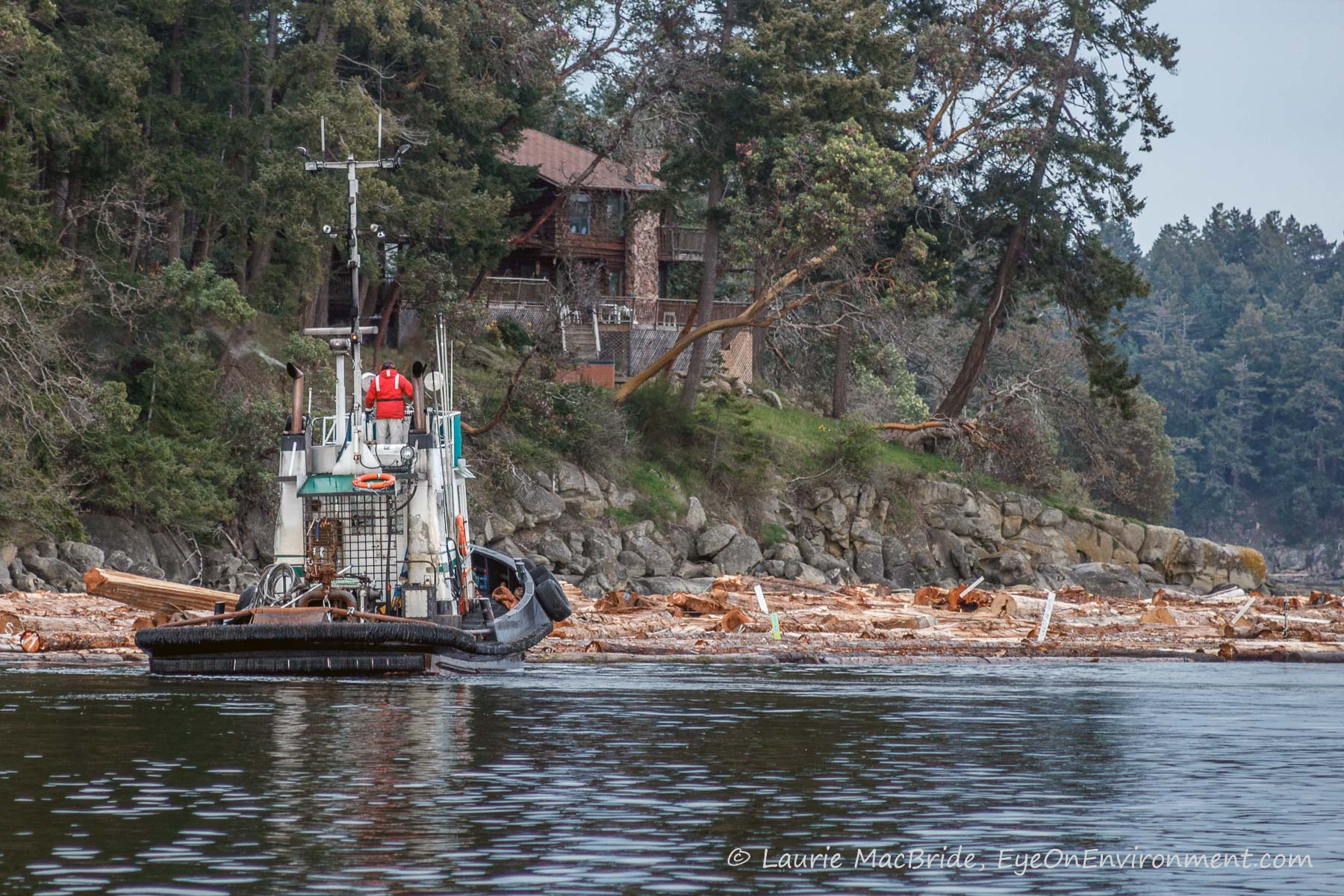 Log booms are normally pulled by a single tug, but you’ll note there are two tugs in the photo above. Navigating Gabriola Pass demands tight reins, especially at the narrow east end, where a sharp turn is needed. So while one tug pulls, a second one often pushes from behind, to prevent the boom from swinging onto the rocks or into oncoming boat traffic. Extra control like the Samantha J provided that day is essential in a tight situation like this, where a tidal current often adds to the challenge.