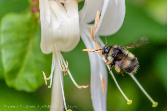 Like us – and like the honeybees (above) – bumblebees have been racing about in our garden as well. You can see the big sacks of pollen on the legs of this one, as it works on the honeysuckle.