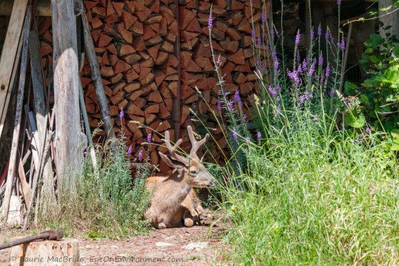 Not everyone here on the homestead is keeping busy, though. Seven year-old QT, the patriarch of our little deer family, seems to make time often for some sunbathing in front of the woodshed.